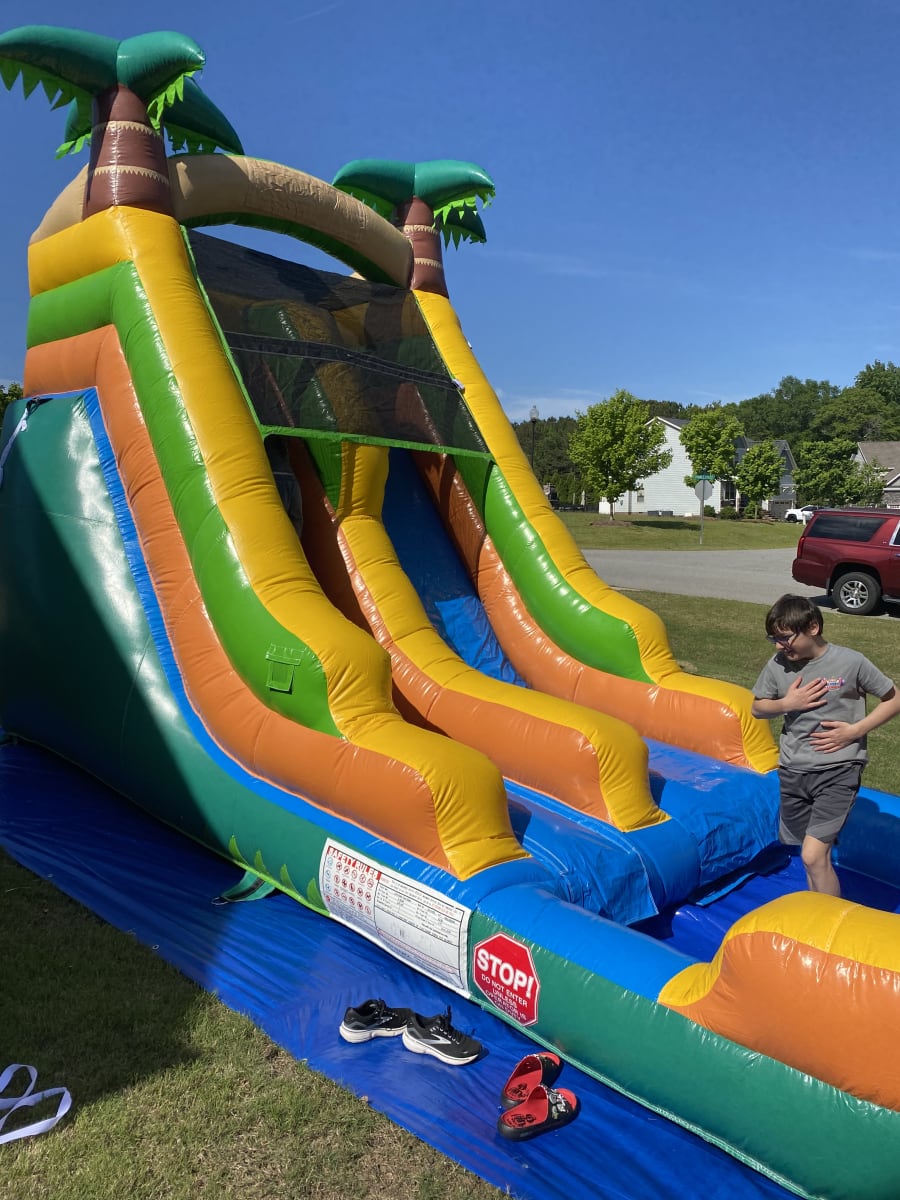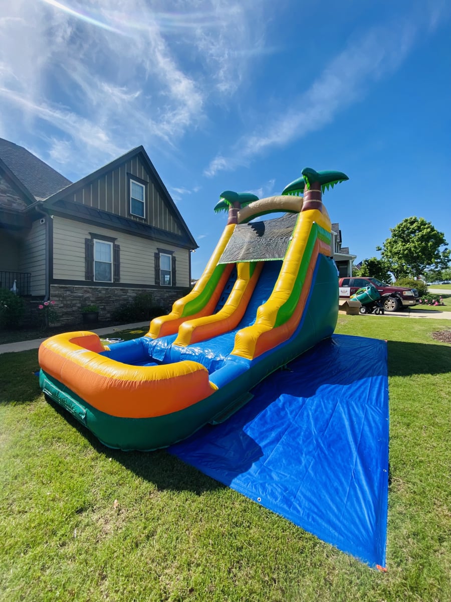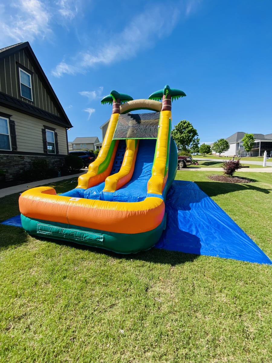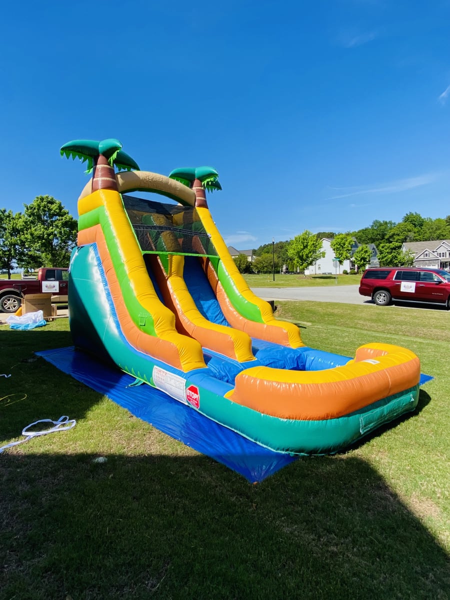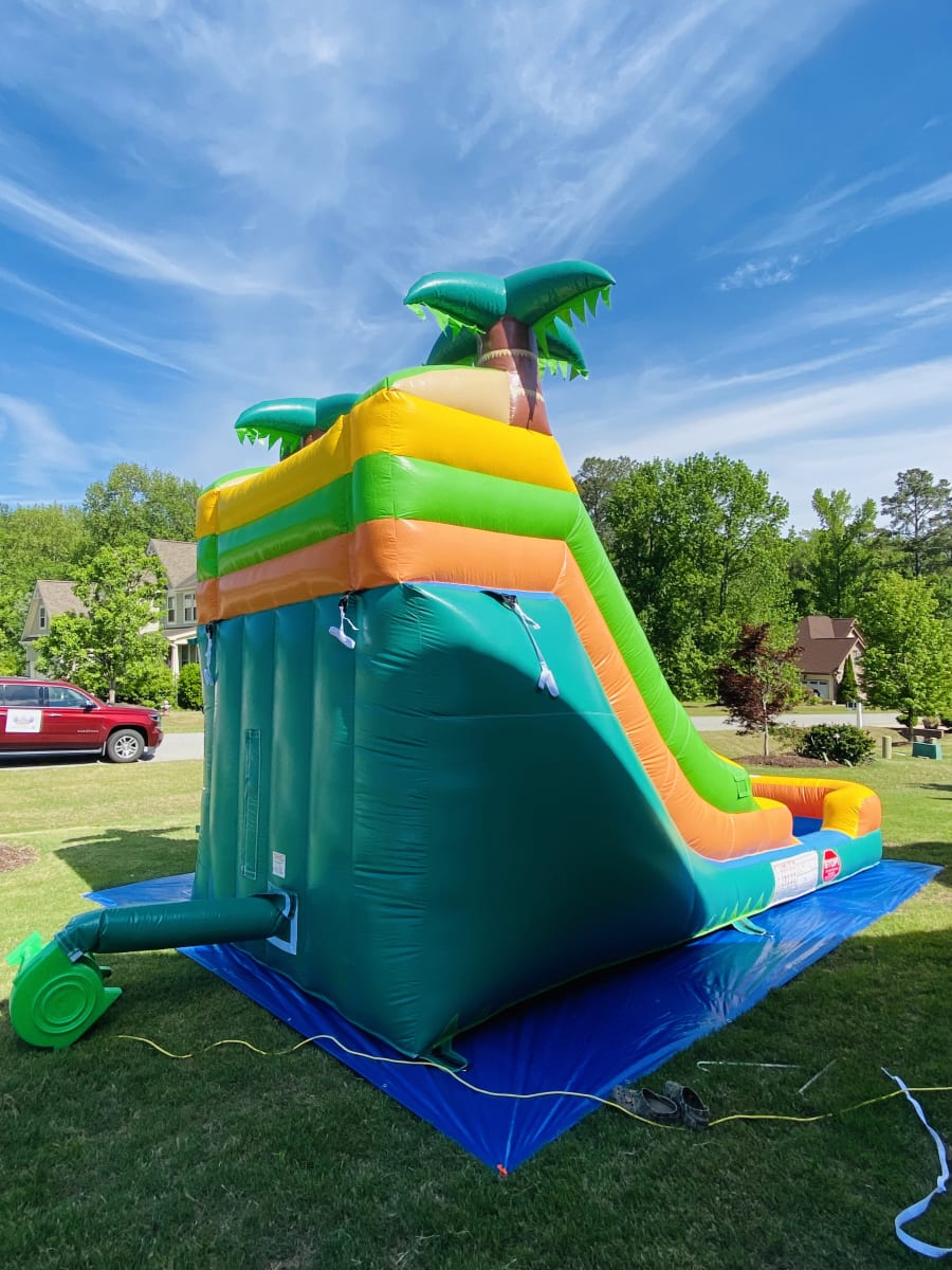 We proudly offer wet or dry slide, party’s, birthday’s + Paw Paw’s 13’ Palm Tree Slide in Angier, Benson, Coats, Dunn, Fuquay Varina, Four Oaks, Selma, Smithfield, Sanford, Lillington and surrounding areas. Enjoy convenient delivery and setup, so you can focus on celebrating while we handle the rest.
